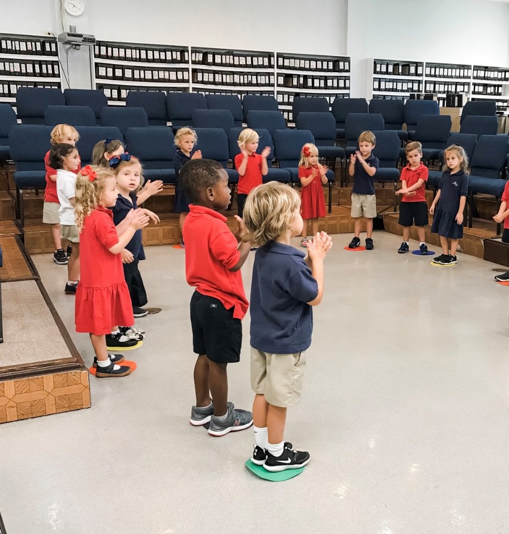 All students, prekindergarten two through fifth grade, attend weekly scheduled classes instructed by a full time music teacher. The curriculum includes Christian, secular, and multi-cultural musical selections and activities which create an environment and provide learning experiences that are designed to enhance the students’ spiritual, moral, intellectual, social, emotional and physical development. The study of music has been shown to specifically enhance academic performance, creativity, critical thinking ability, and self-esteem as well as language, cognitive, and social skills. The musical experiences provided at all grade levels are vital to a student’s development, allowing a student to experience joy and satisfaction along with a sense of accomplishment. This gives students a means of expressing their feelings.