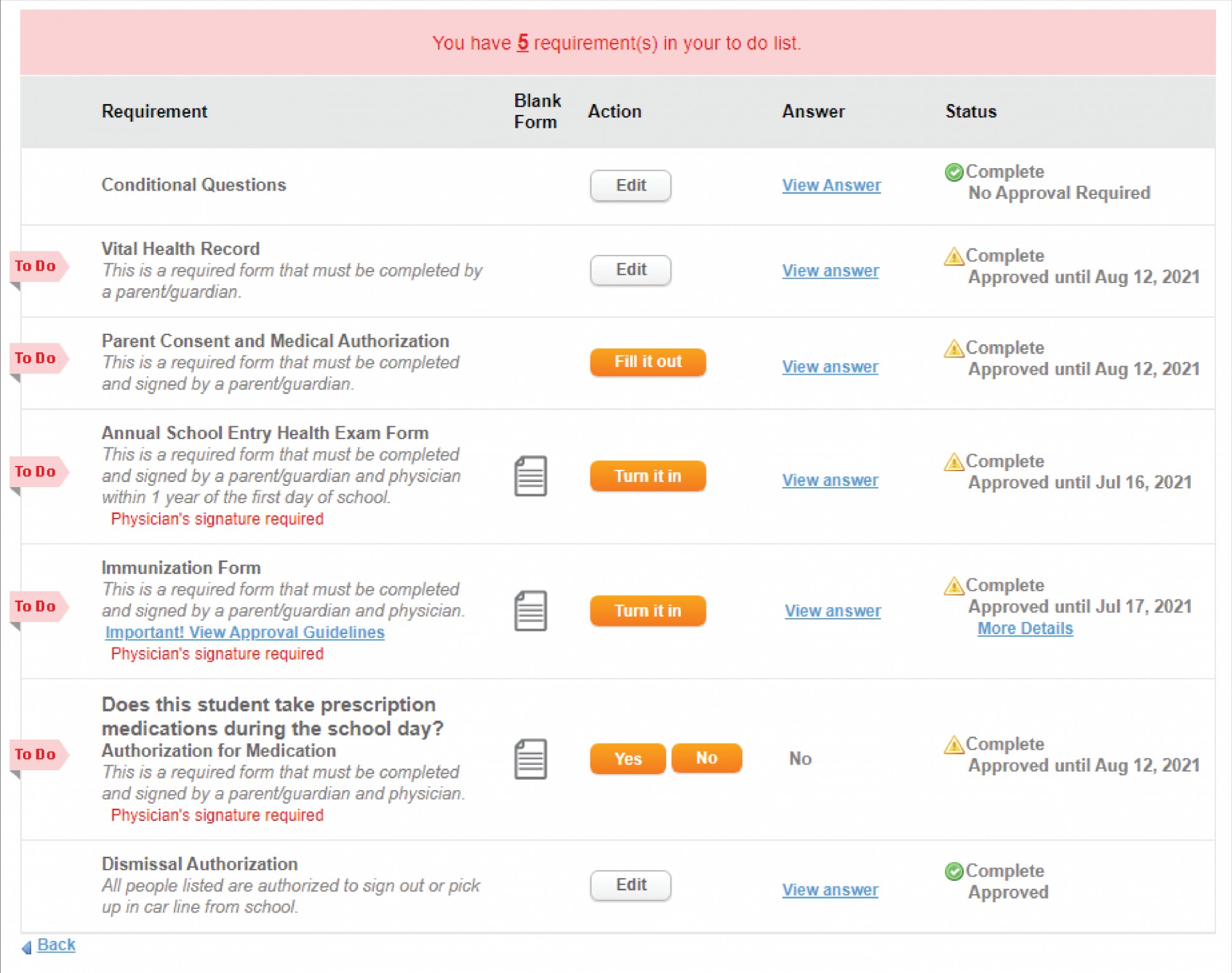 - View the list of requirements and which items need to be addressed or updated prior to their expiration dates in the 'Status' column. You can click 'Edit' to update any of the previously completed sections. Every student must have an updated Health Exam Form, Immunization Form, and Authorization for Medication (if applicable) from their physician prior to their expiration date. Click 'Turn it in' to scan and upload your completed forms.