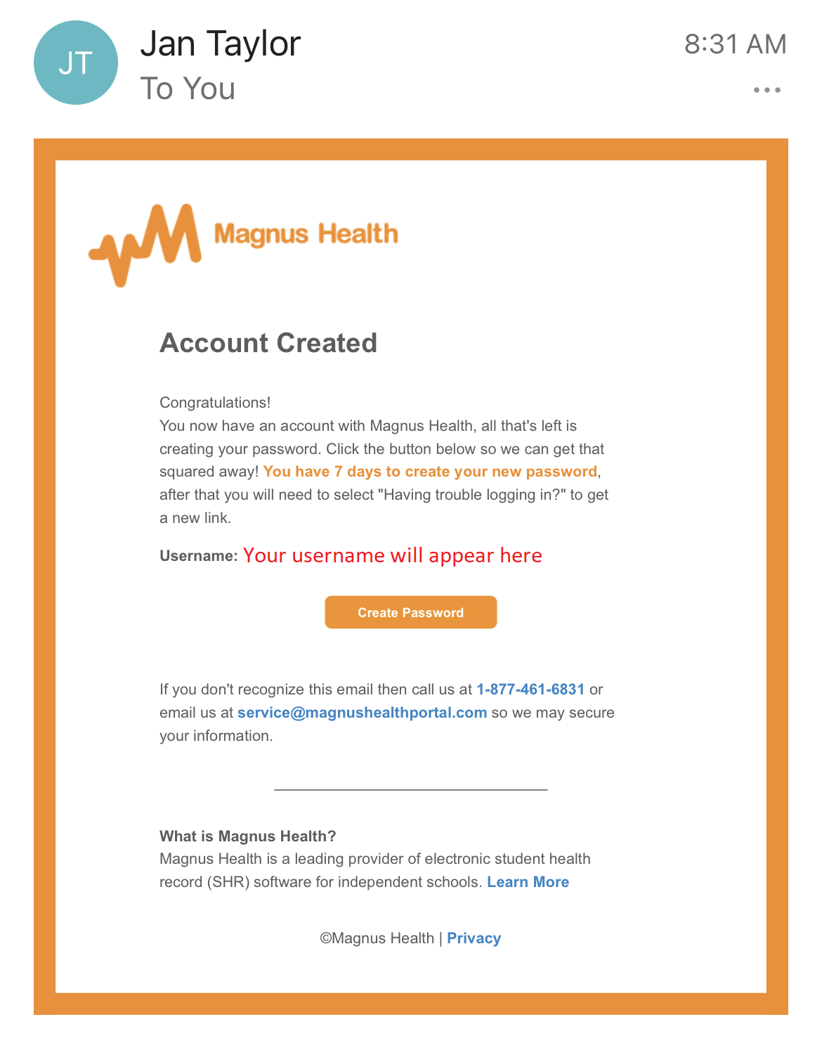 - Open the email that was sent from Jan Taylor with subject line <[Christ Church School] You're invited to join our Magnus Health account>. This email was sent to the address you provided to CCS.